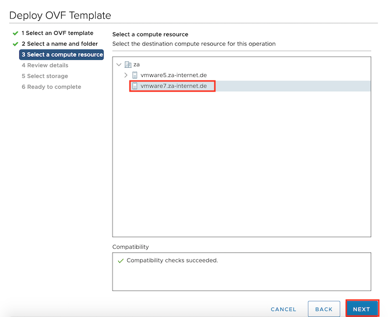 Select the location where you want to deploy the Video Surveilance C-MOR inside your VMware Infrastructure: